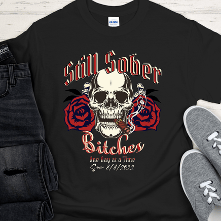 Show your naysayers what's up with this custom recovery t-shirt! Featuring your own special recovery date to inspire your sobriety, this shirt is sure to make a statement. Still Sober Bitches, and ready to show it!