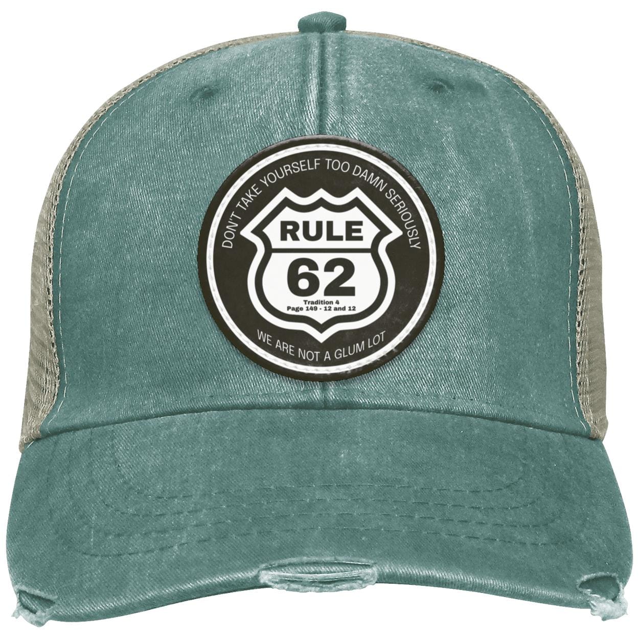 Stay inspired and lean on Rule 62 with the Recovery Distressed Ollie Cap. Don't take yourself too seriously - embrace the quirks and humor of your journey with this iconic reminder. Perfect for AA/NA members, never forget to keep things light and fun!