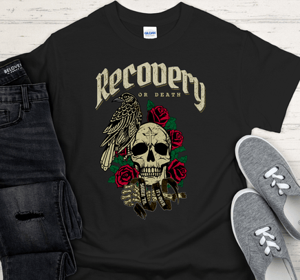 This unisex T-Shirt stands out with its symbolic design and bold message - "Recovery or Death". Featuring a skull with roses and a raven, this apparel conveys a powerful reminder of the stakes of recovery and can be a source of strength.