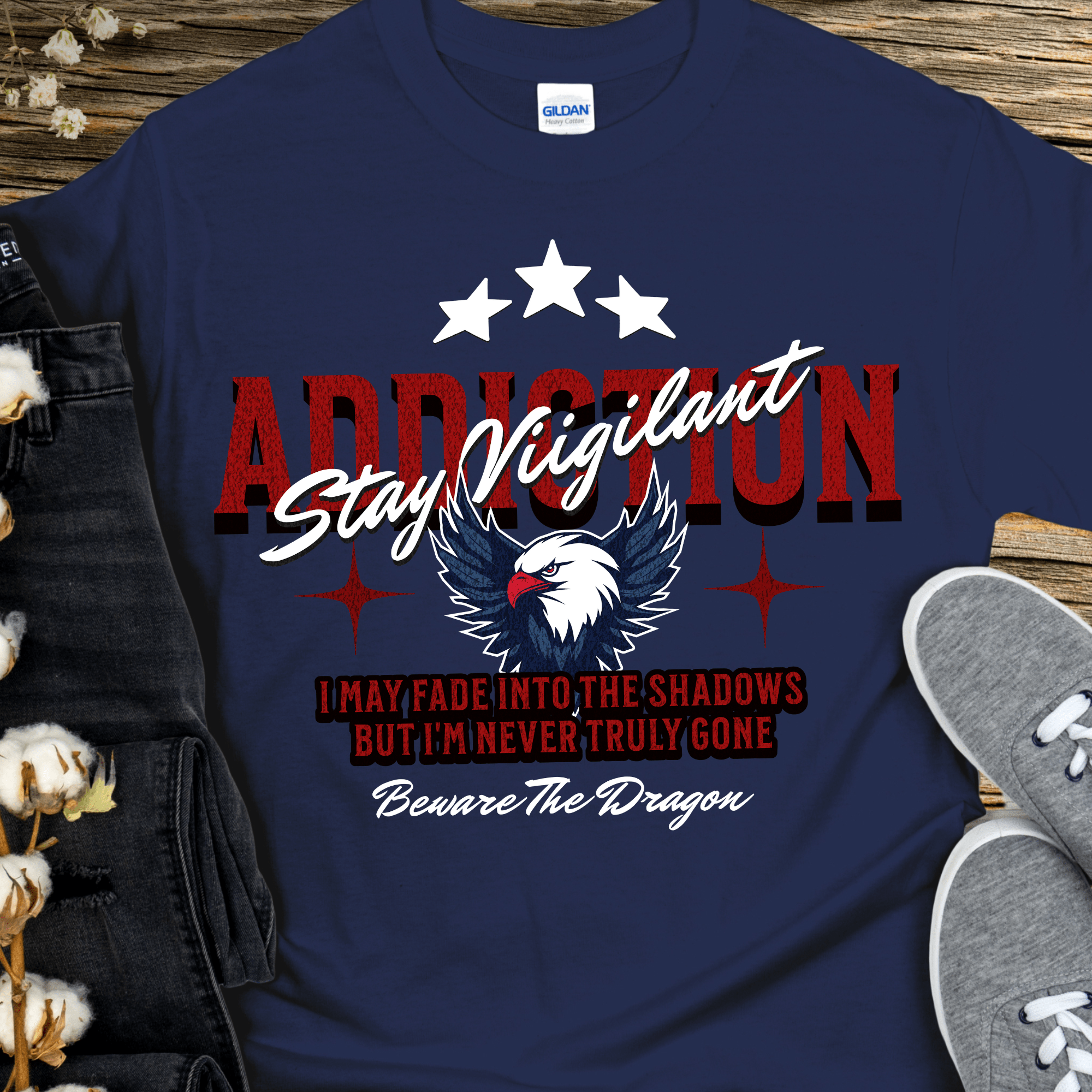 Stay sharp and conquer addiction with our Recovery T-Shirt. Featuring a bold eagle design, this shirt serves as a daily reminder to stay vigilant and never let your guard down. Take on the challenge and stay inspired to reach sobriety.