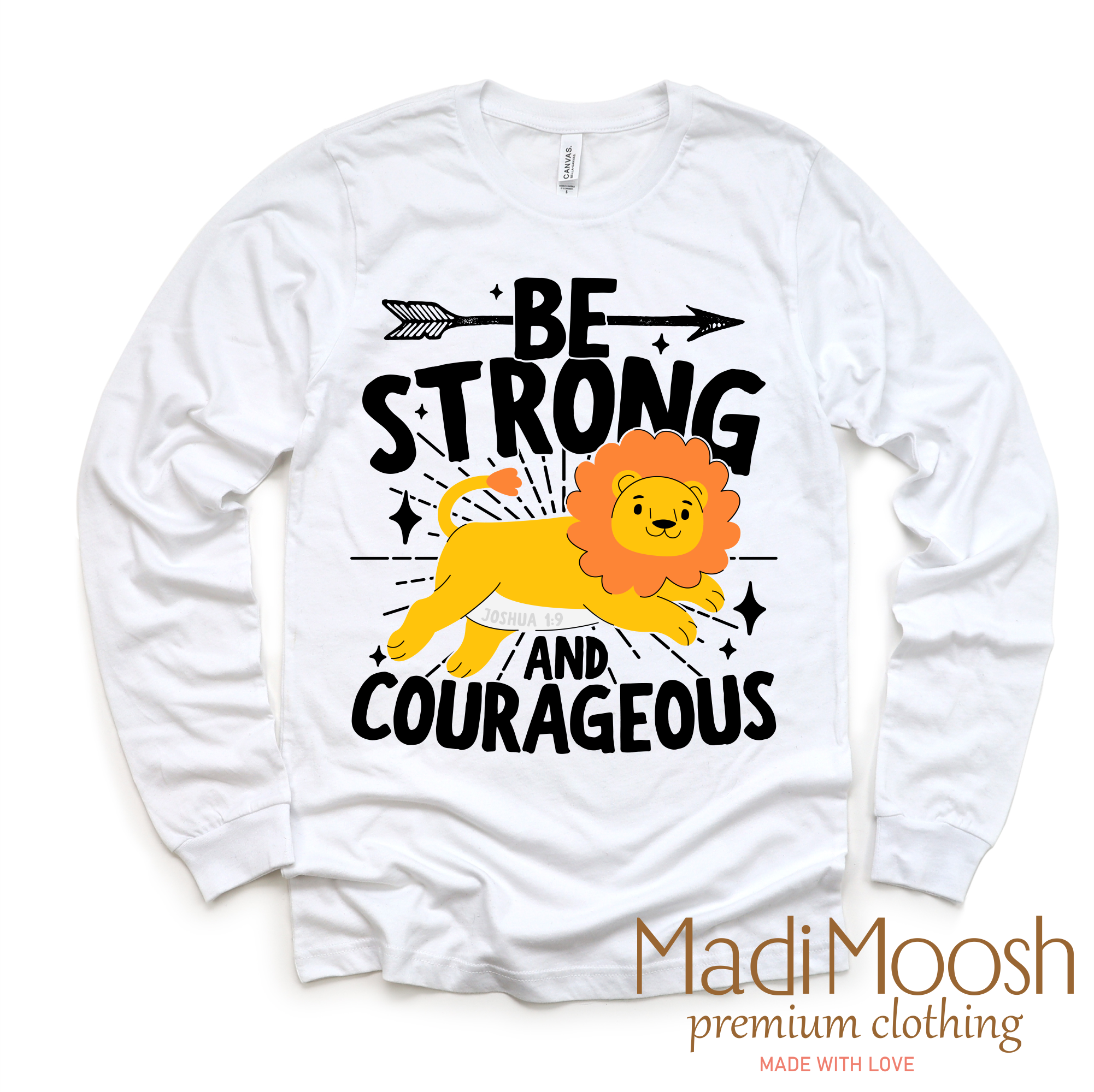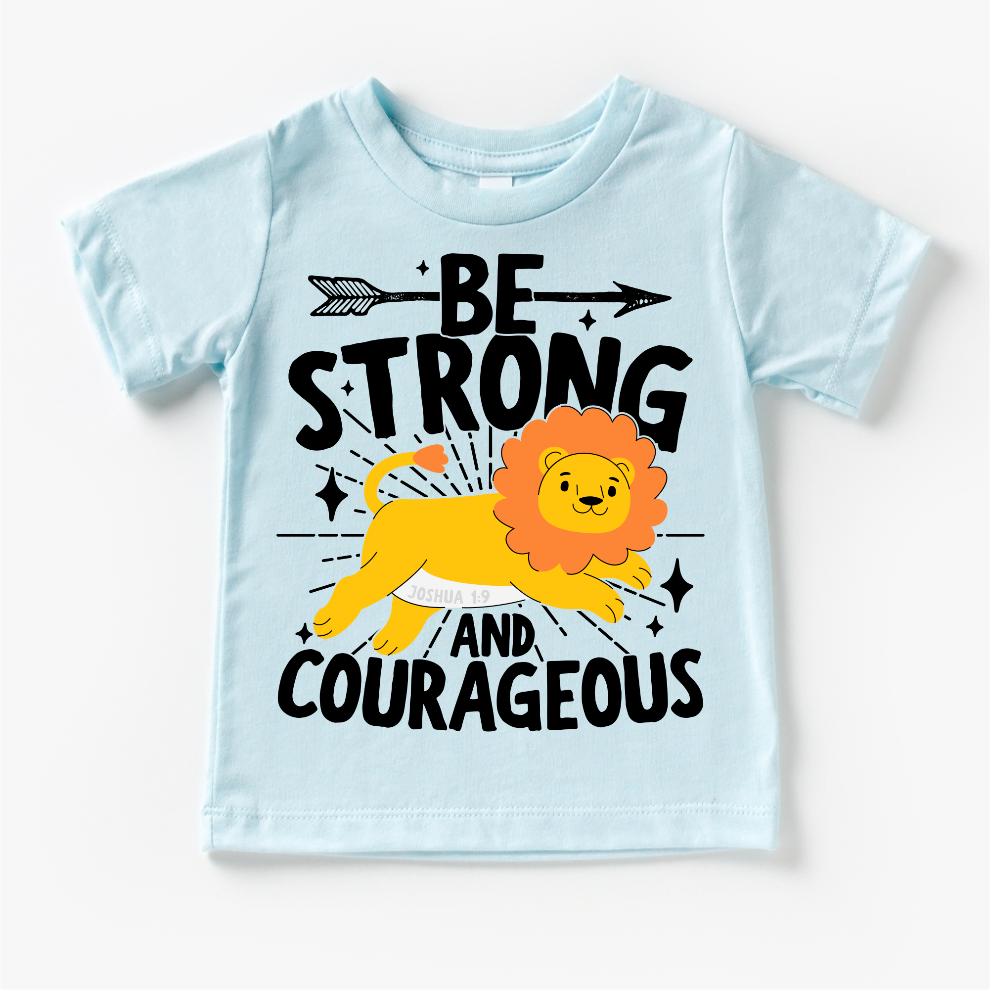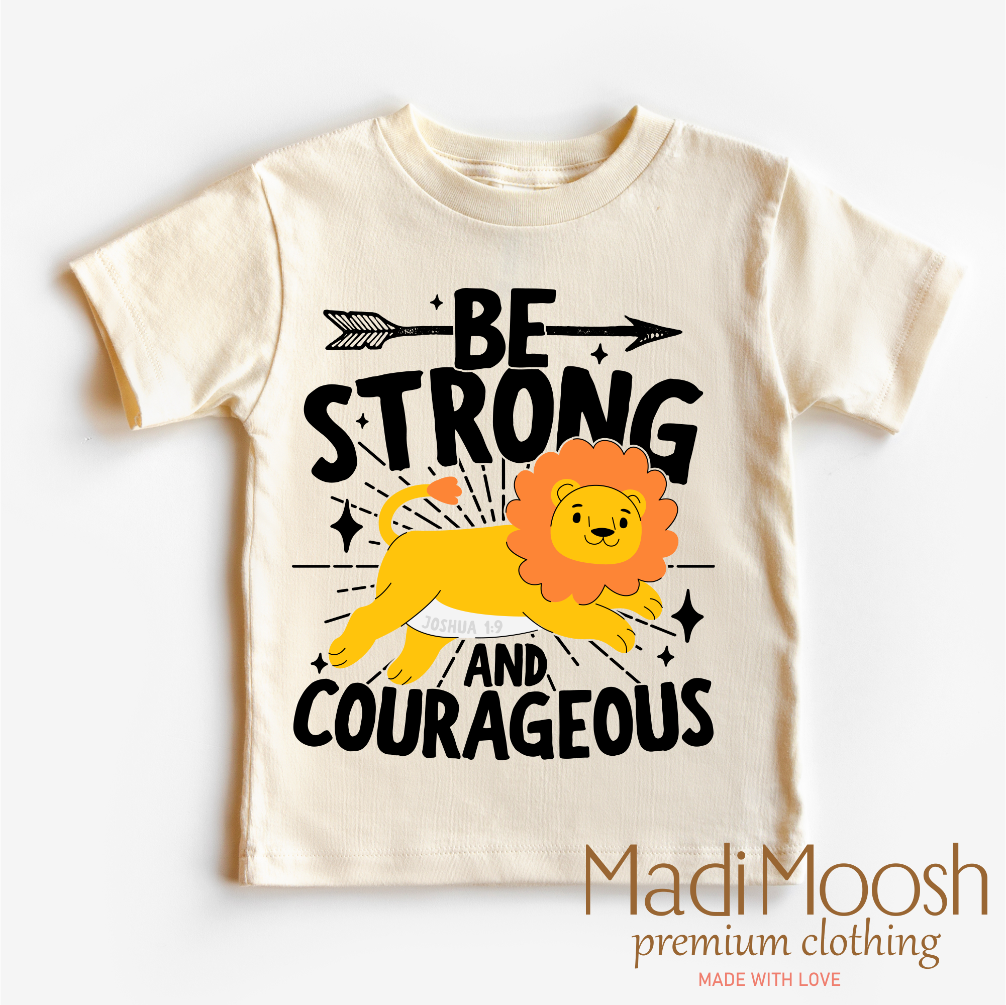 As a product expert in the kid's apparel industry, we proudly present our "Be Strong And Courageous" shirt. Made with high-quality material, this tee is comfortable and durable for active kids. With its inspiring Christian message, it's the perfect shirt for little ones to spread positivity and faith.