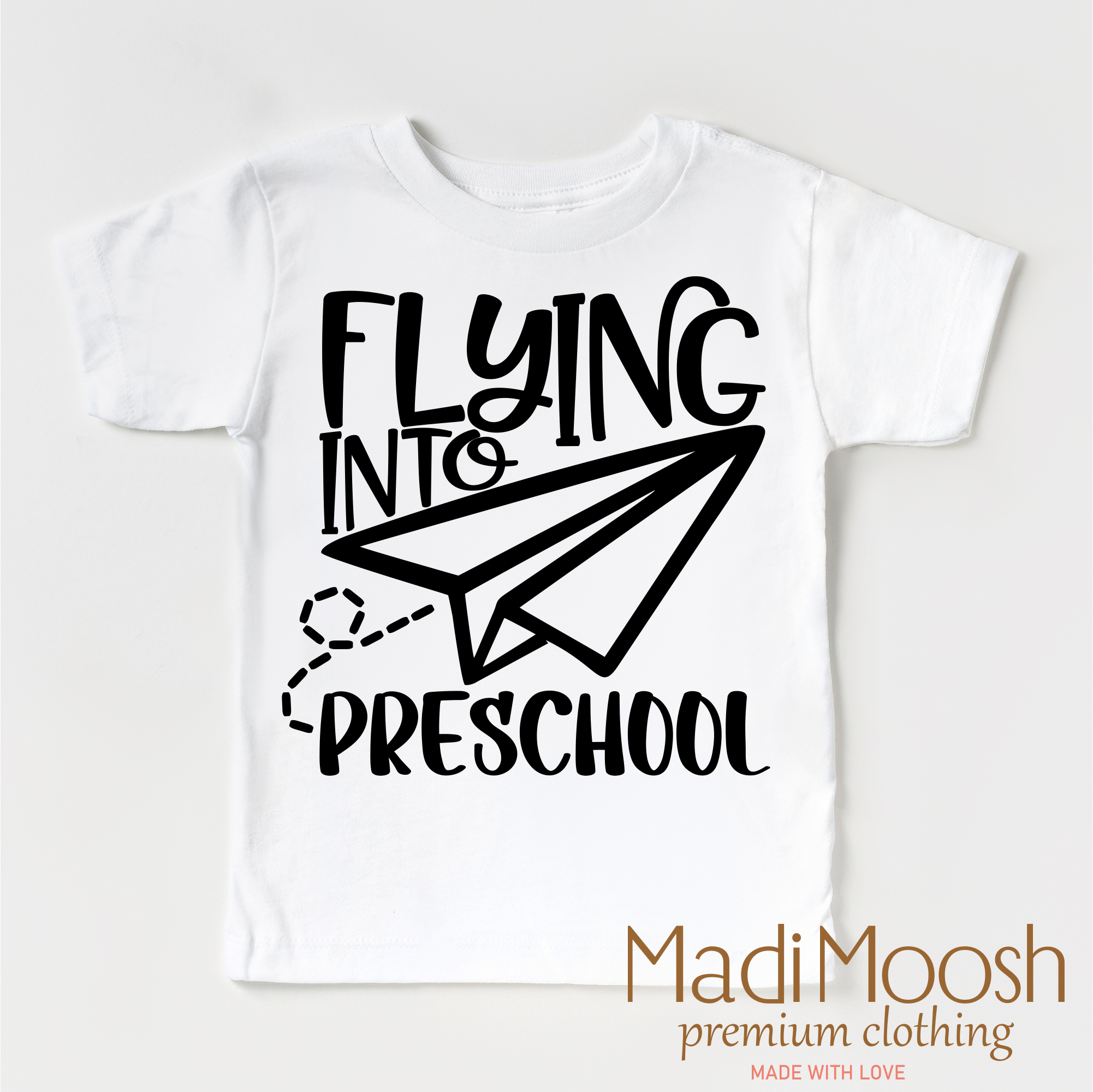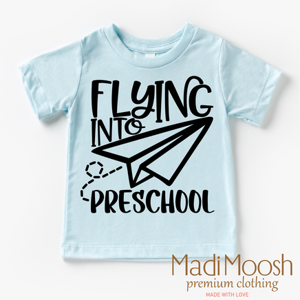 Introduce your little one to their first day of school in style with our Flying Into Preschool Back To School Shirt. Made from 100% cotton, this comfortable and durable shirt features a playful "Flying Into Preschool" graphic. Perfect for capturing those precious back to school moments.