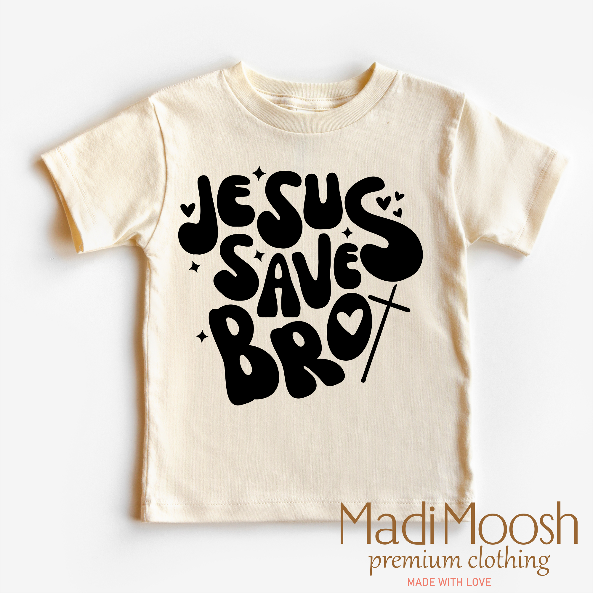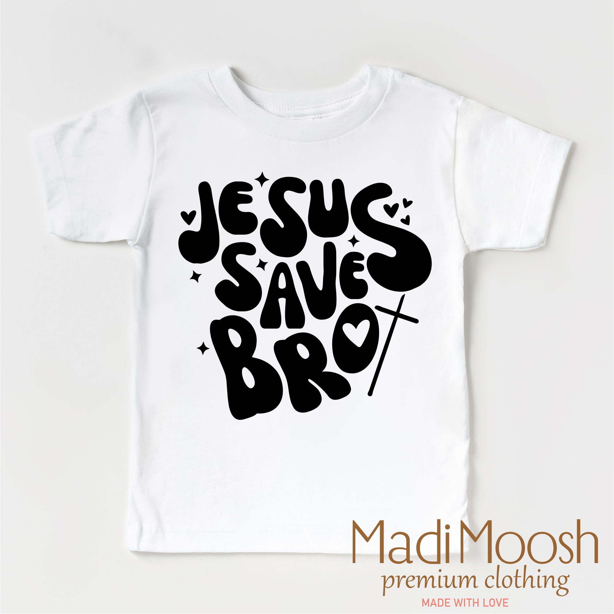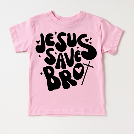 This kids' Christian tee boldly proclaims "Jesus Saves Bro" in a simple and modern design. Made of high-quality materials, this tee provides both comfort and a powerful message of faith. Perfect for children looking to express their belief in Jesus Christ.