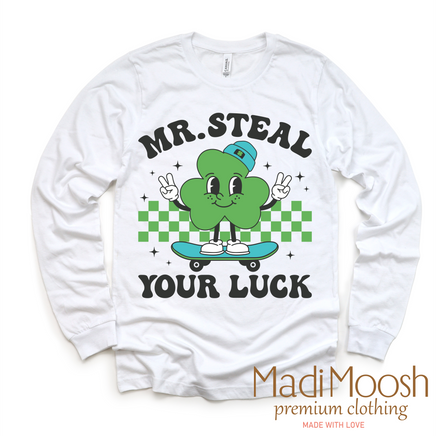 This St. Patrick's Day, show off your festive spirit with our Mr. Steal Your Luck t-shirt. Made with high-quality materials, this shirt is perfect for celebrating the holiday in style. Get lucky and steal the show with this St. Patrick's Day tee.