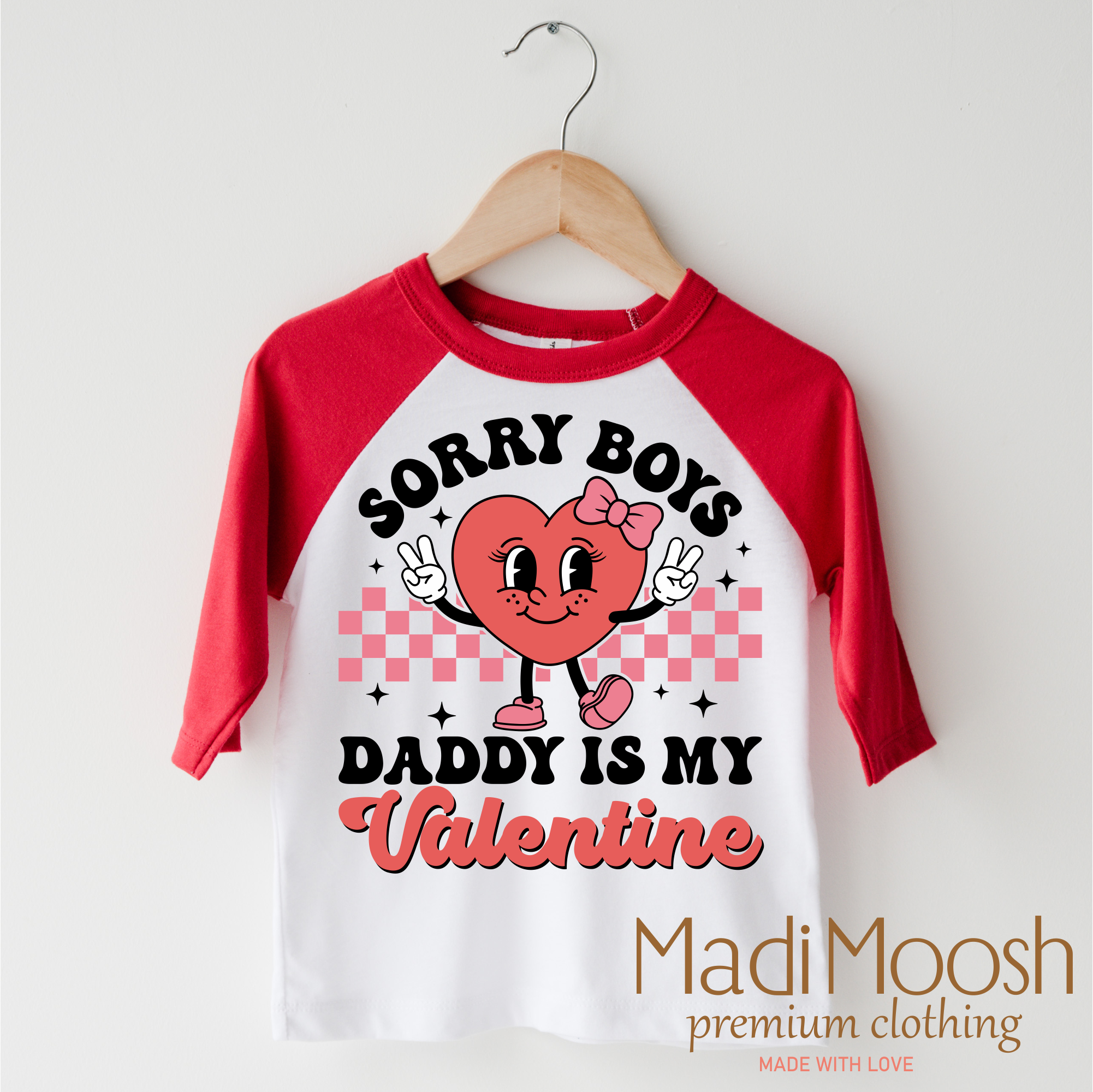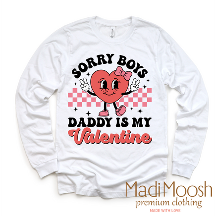 Professionally show your love for Daddy this Valentine's Day with our "Sorry Boys Daddy Is My Valentine" tee. Made from high-quality material, this comfortable t-shirt is a perfect gift for any occasion. Show your appreciation for the special man in your life with this heartfelt shirt. Order now!