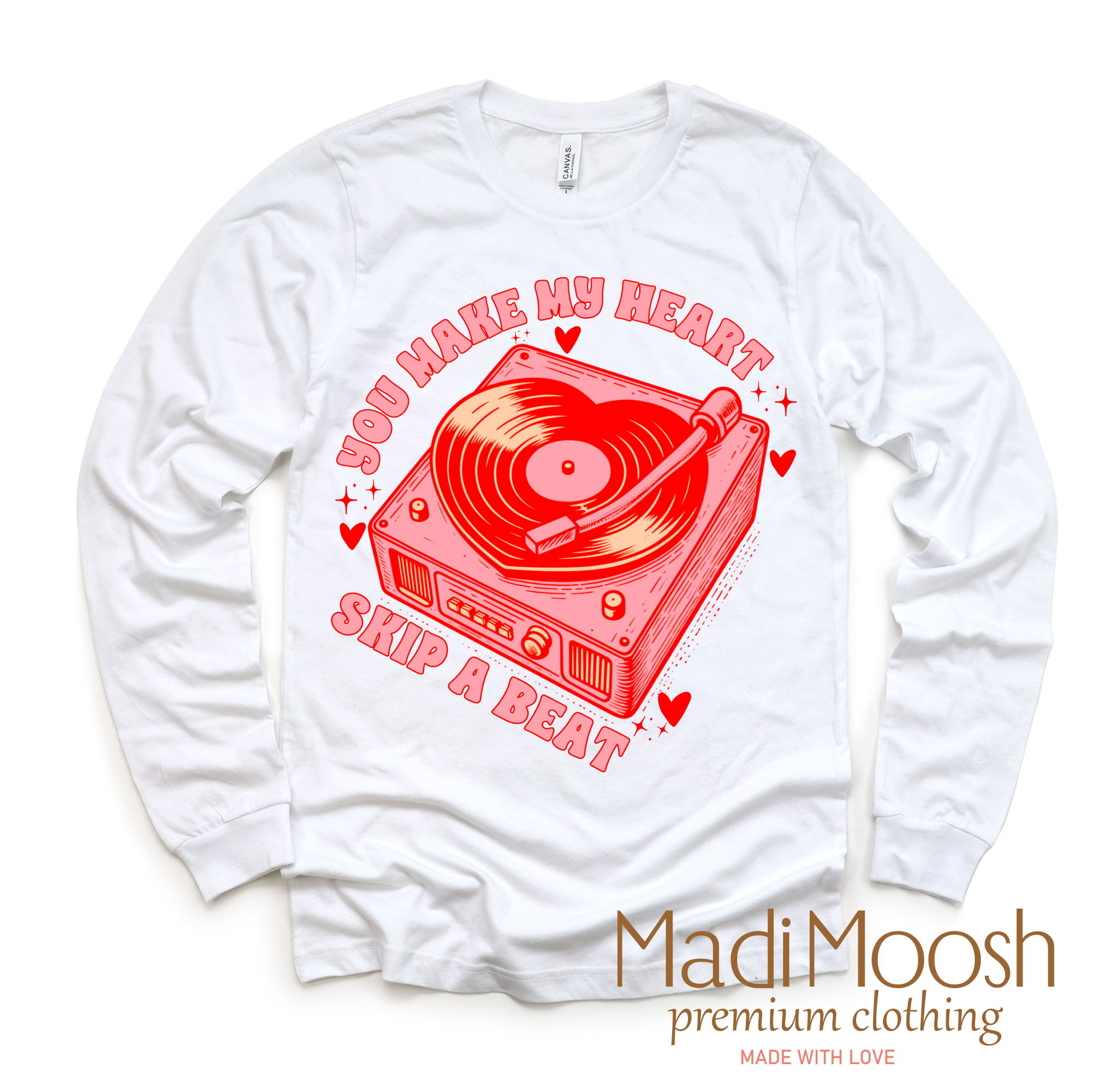 This Valentine's Day, express your love in style with our retro-inspired You Make My Heart Skip A Beat T-Shirt. Crafted with high-quality fabric, this tee offers both comfort and durability. Perfect for casual wear or a thoughtful gift, show your affection with this charming Valentine's Day shirt.